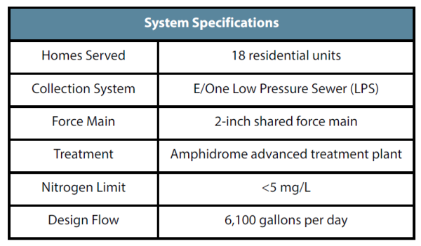 The development utilizes an E/One Low Pressure Sewer (LPS) system to efficiently collect and transport wastewater from each residence to a centralized Amphidrome advanced treatment system. The Amphidrome provides biological nutrient removal capable of achieving effluent nitrogen concentrations below the required 5 mg/L threshold, a critical performance standard for protecting the nitrogen sensitive coastal waters surrounding Martha’s Vineyard.